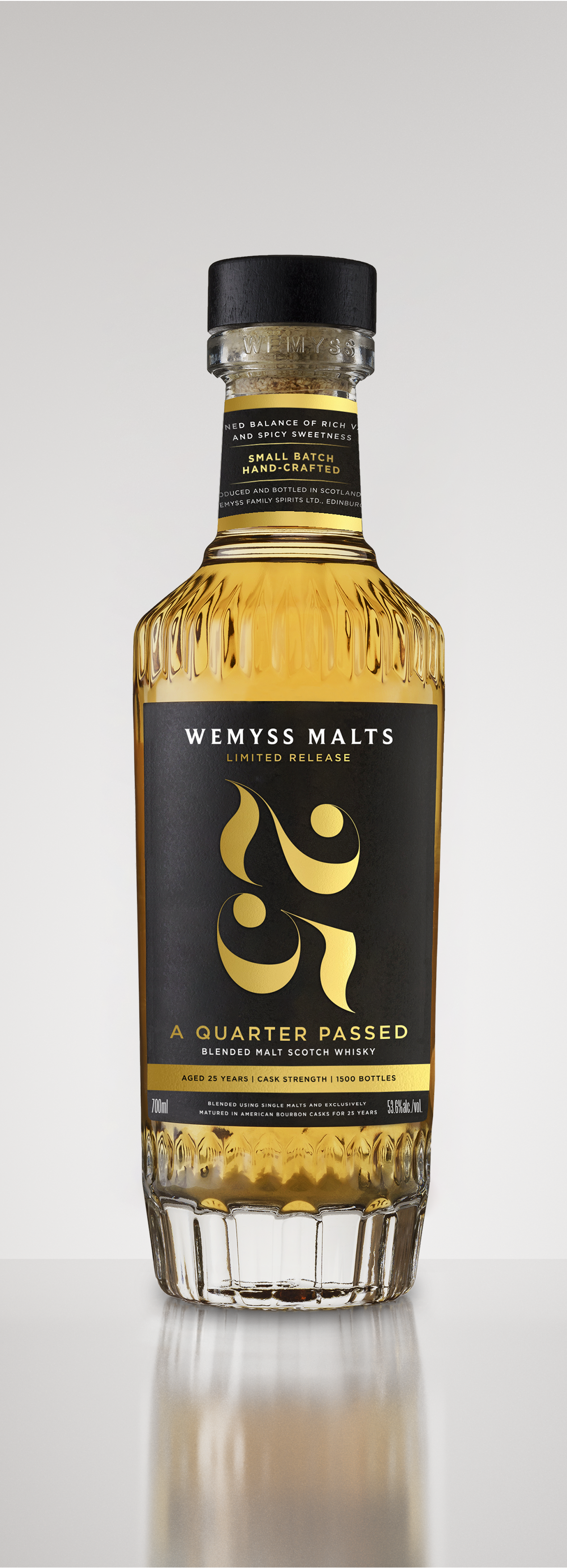 A QUARTER PASSED is an expression that honours patience and the passing of time in whisky making. It is a rare and exclusive limited edition blended Scotch malt whisky with an eloquently rich character.